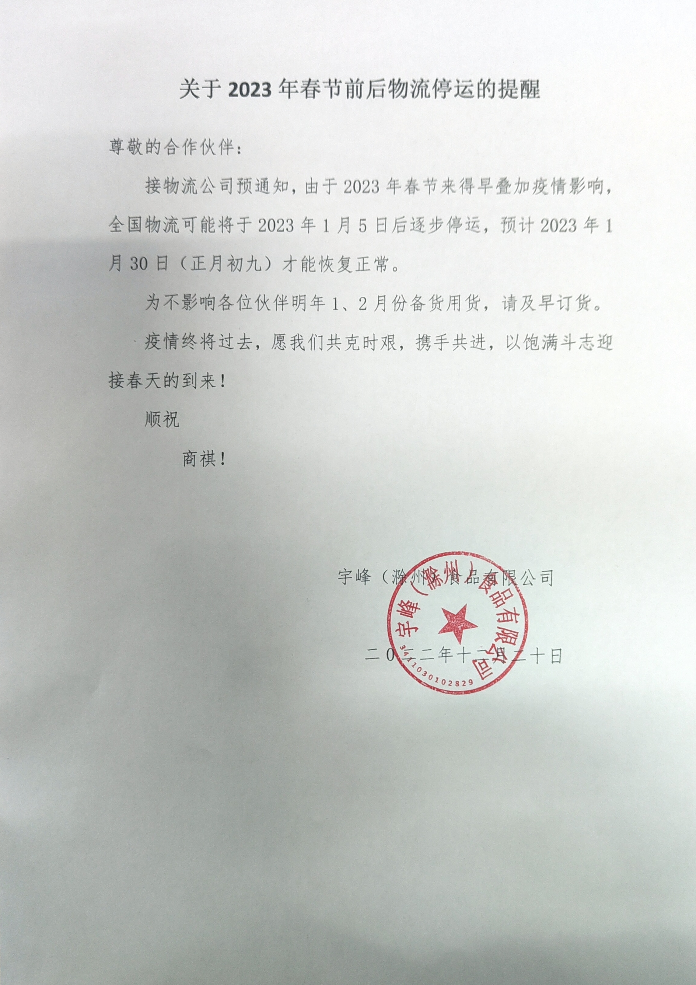 關(guān)于2023年春節(jié)前后物流停運(yùn)的提醒